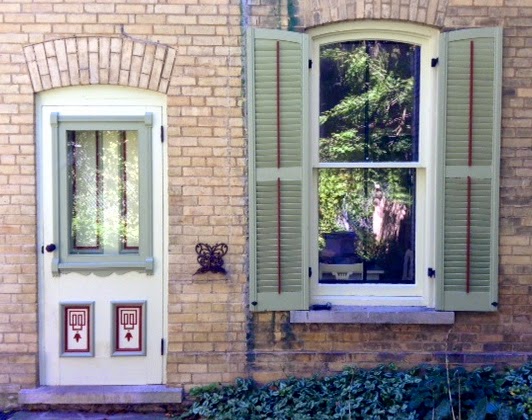 The inside of the door is kept clean and simple, only the hardware offers a contrast. I will soon have to remove the screen frame insert and put in the glass one - sigh... summer's almost over.